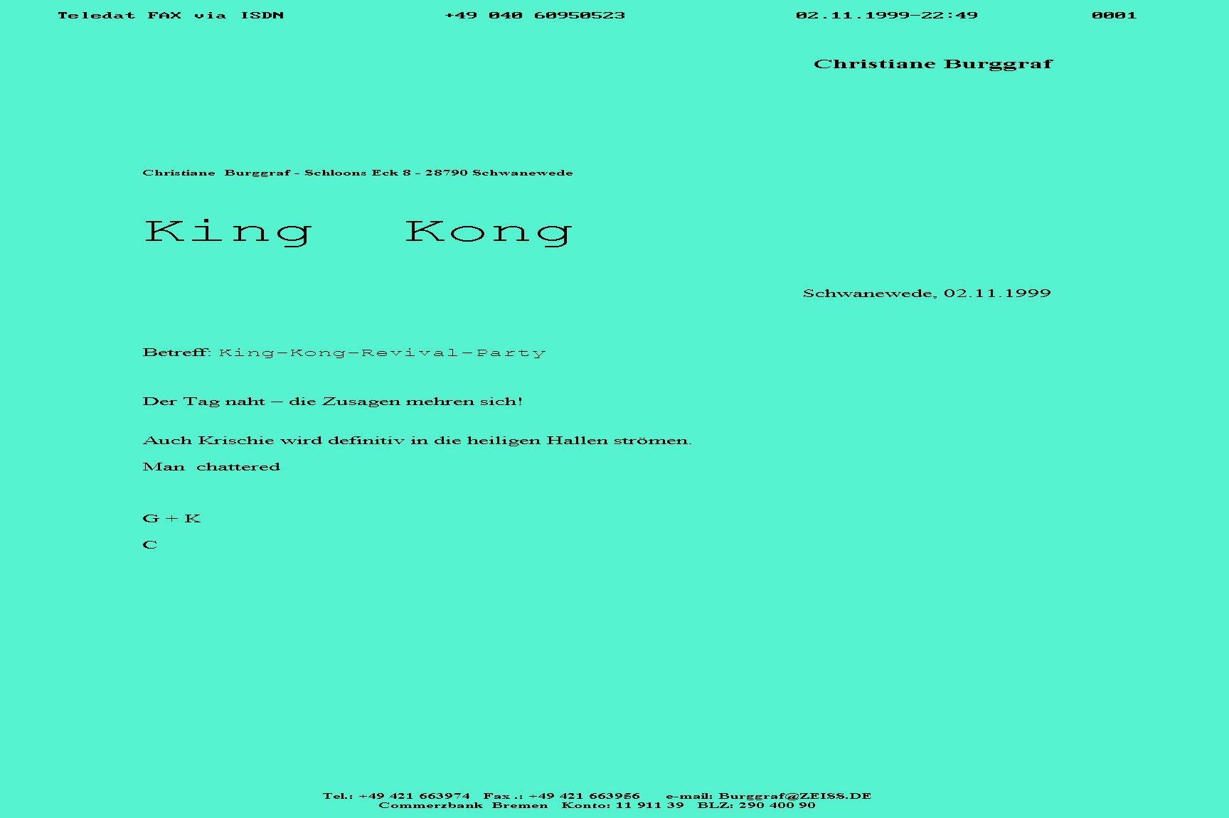 Lieber Thomas! I don't believe it!!! Nach all diesenJahren......."eine King-Kong Party"!Vielen Dank fuer Deine Karte. Leider konnte ich nichts unter http: etc. finden.Ich bin noch ein Neuling in der Welt of the Cyberspace.So hoffe ich etwas mehr von Dir zu hoeren.Ich wuerde ja zu gern zur Party kommen,sie ist nur etwas weit weg von hier und das vor Weihnachten (boohoo). Es erfreute mich riesig von Dir zu hoeren. Ich hoffe es geht Dir,Familie und Freunden gut. Bis bald RIA